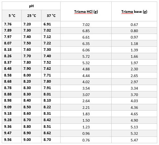 Tris為弱堿,在常溫(25℃)下,它的pKa為8.1,根據(jù)緩沖理論,Tris緩沖液的有效緩沖范圍在pH 7.1到9.1之間。0.1 M的水溶液pH為10.4,一般加入鹽酸以調(diào)節(jié)pH值,即可獲得所需pH值的緩沖液。但同時應(yīng)注意溫度對于Tris的pKa的影響對于 Tris 緩沖液,溫度每降低 1pH 增加約0.03 個單位,濃度每稀釋 10 倍,pH 降低 0.03-0.05 個單位。對于精確應(yīng)用,使用帶有玻璃/甘汞復(fù)合電極的經(jīng)仔細(xì)校正的 pH 計。