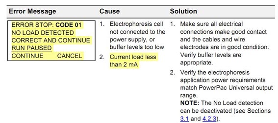Blue Native PAGE凝膠電泳期間,電流下降至低于1 mA很常見(jiàn)。有些電泳電源如伯樂(lè)電源有負(fù)載檢查功能,電流過(guò)低(低于4mA) 會(huì)認(rèn)為沒(méi)有負(fù)載,報(bào)錯(cuò)E1錯(cuò)誤代碼,終止電泳。解決方法是更換電泳電源,如使用國(guó)產(chǎn)電源;另外可以調(diào)高電壓高于300 V,使得電流不要低于4mA。