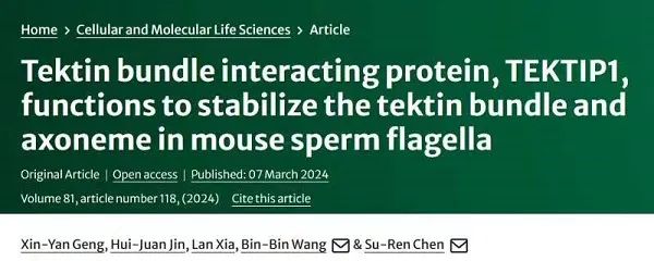 2024年3月7日,北京師范大學(xué)陳蘇仁課題組在國(guó)際細(xì)胞分子生物學(xué)領(lǐng)域知名期刊Cellular and Molecular Life Sciences發(fā)表了題為T(mén)ektin bundle interacting protein, TEKTIP1, functions to stabilize the tektin bundle and axoneme in mouse sperm flagella的研究論文,通過(guò)基因敲除小鼠和分子生化手段揭示了TEKTIP1蛋白發(fā)揮著穩(wěn)定精子鞭毛微管腔內(nèi)tektin束和軸絲穩(wěn)定性的關(guān)鍵作用,推動(dòng)了人們對(duì)于精子運(yùn)動(dòng)結(jié)構(gòu)與分子機(jī)制的科學(xué)認(rèn)識(shí)。