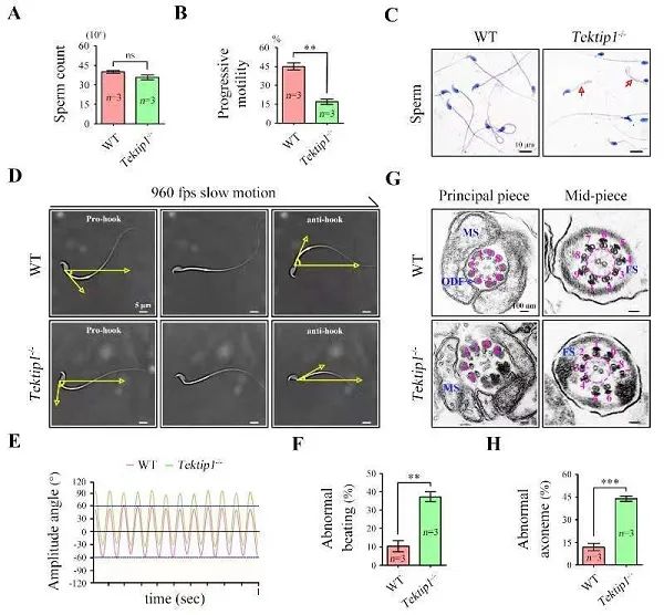 陳蘇仁課題組利用CRISPR/Cas9基因編輯技術(shù)構(gòu)建了Tektip1基因敲除小鼠,敲除鼠生長(zhǎng)發(fā)育正常但雄性生育力顯著降低,主要表現(xiàn)為一定程度的精子軸絲結(jié)構(gòu)破壞和精子運(yùn)動(dòng)軌跡改變(圖1)。