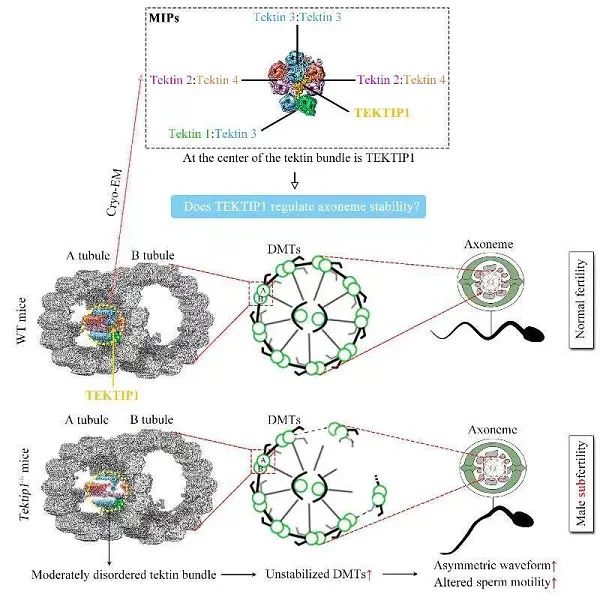 綜上所述,本項(xiàng)研究對(duì)cryo-EM所解析的MIP結(jié)構(gòu)進(jìn)行了功能性驗(yàn)證,揭示了TEKTIP1蛋白的確發(fā)揮著穩(wěn)定tektin束和軸絲結(jié)構(gòu)的關(guān)鍵作用(圖2)。TEKTIP1基因突變可能是弱精子癥潛在的致病遺傳因素,尚需與臨床結(jié)合開(kāi)展相關(guān)研究。