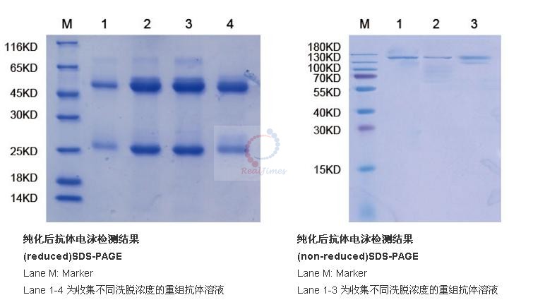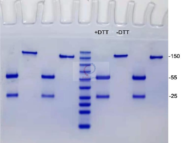 如需測定目標(biāo)蛋白的純度及分子量(為多聚體分子量),則一般采用非還原SDS-PAGE:采用該電泳方法,二聚體、多聚體在凝膠中的位置會處于單體分子量2倍或多倍的位置,利于觀察及各組分的定性定量分析。當(dāng)然這種蛋白的聚體形成是依靠二硫鍵來維持的。