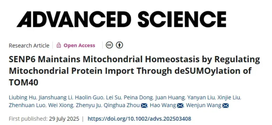 2025年7月29日,暨南大學(xué)王文君,暨南大學(xué)附屬第一醫(yī)院王昊、周慶華共同通訊在Advanced Science 在線發(fā)表題為“SENP6 Maintains Mitochondrial Homeostasis by Regulating Mitochondrial Protein Import Through deSUMOylation of TOM40”的研究論文。該研究闡明了SENP6敲低誘導(dǎo)的SUMO化會(huì)導(dǎo)致線粒體蛋白質(zhì)穩(wěn)態(tài)喪失,從而損害線粒體的形態(tài)和功能。