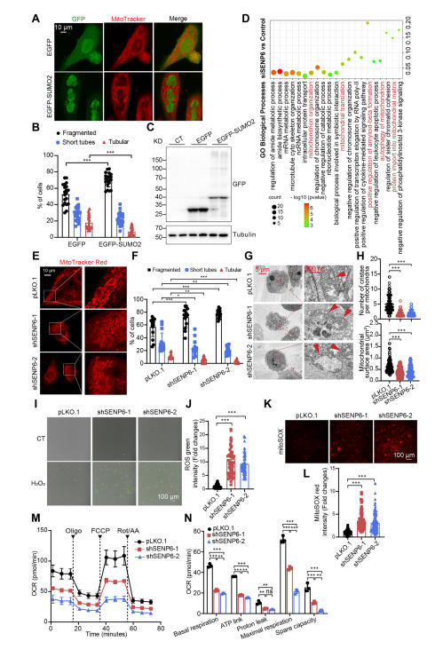 SUMO 化通過共價(jià) SUMO 結(jié)合賴氨酸殘基來動(dòng)態(tài)修飾蛋白質(zhì),由 E1 激活酶、E2 結(jié)合酶和 E3 連接酶介導(dǎo),而去 SUMO 化則由 SENPs 調(diào)控。與泛素化介導(dǎo)的降解不同,SUMO化會(huì)調(diào)節(jié)蛋白質(zhì)的活性、定位和穩(wěn)定性,從而影響基因表達(dá)、基因組完整性、細(xì)胞周期、細(xì)胞凋亡和免疫功能。最近的研究表明,SUMO化/去SUMO化參與調(diào)控線粒體的生物合成、動(dòng)力學(xué)、線粒體自噬和線粒體未折疊蛋白反應(yīng)(UPRmt)。此外,線粒體蛋白質(zhì)輸入障礙和蛋白質(zhì)穩(wěn)態(tài)受損會(huì)引發(fā)酵母中線粒體蛋白質(zhì)的SUMO化,這表明SUMO化可能也在線粒體蛋白質(zhì)輸入系統(tǒng)中發(fā)揮作用。SENP6特異性地裂解polySUMO2/3鏈,從而調(diào)控DNA修復(fù)、細(xì)胞凋亡、衰老、著絲粒組裝、炎癥、小膠質(zhì)細(xì)胞極化、血管生成和核結(jié)構(gòu)。其功能障礙與淋巴瘤、核纖層蛋白病和骨骼衰老有關(guān)。然而,SENP6 在線粒體穩(wěn)態(tài)中的作用仍未得到深入研究。