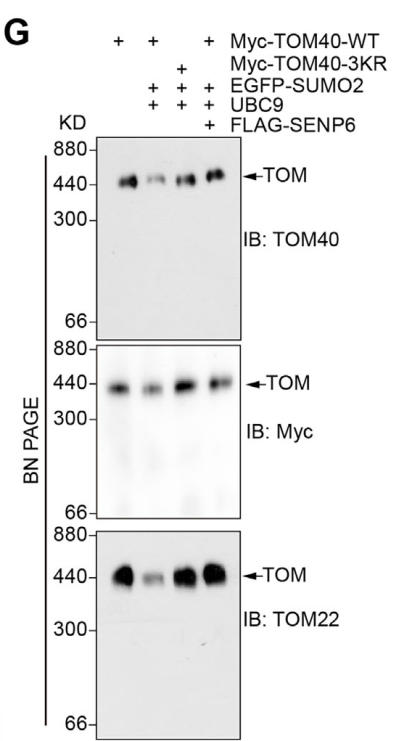 從機(jī)制上講,SENP6敲低通過SUMO化TOM40來抑制TOM復(fù)合物的組裝,從而阻礙線粒體蛋白質(zhì)輸入過程(包括TOM40前體),最終破壞線粒體穩(wěn)態(tài)。此外,研究還觀察到,CCCP 處理導(dǎo)致 3×Tg-阿爾茨海默病 (AD) 小鼠或 Aβ1-42 肽刺激細(xì)胞的腦內(nèi)線粒體中 SENP6 減少,同時(shí) TOM40 SUMO 化增加??傊?,這些結(jié)果表明 Aβ1-42 的積累可能通過抑制 SENP6 來增強(qiáng) TOM40 SUMO 化,從而通過蛋白質(zhì)輸入障礙損害線粒體穩(wěn)態(tài),并可能促進(jìn) AD 的病理過程。該研究闡明了在線粒體應(yīng)激過程中TOM40 SUMO 化/去 SUMO 化調(diào)控線粒體輸入過程中的作用。