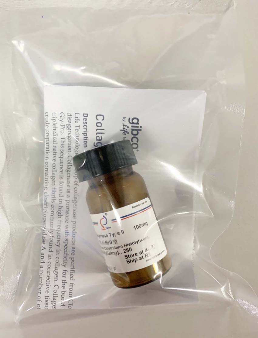 說明:Prepared from Clostridium histolyticum for dissociation of tissues. Type II contains higher protease contaminant levels than Type I, especially clostripain and trypsin. Suggested for preparation of cells from liver, bone, thyroid, heart,  cartilage, and salivary gland tissue.