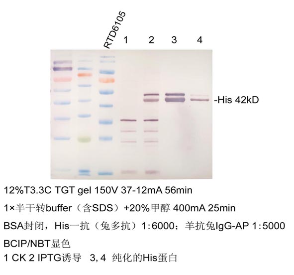 1.2 將印跡膜完全浸入到適量BCIP/NBT 顯色液中,常溫避光孵育 10-20 分鐘,至膜上條帶清晰可見。顯色完畢后,將膜浸入水中,終止反應(yīng)。