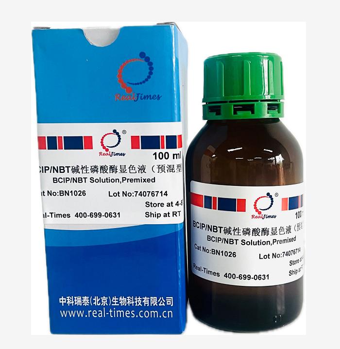 BCIP (5-Bromo-4-chloro-3-indolyl phosphate) 5-溴-4-氯-3-吲哚基-磷酸鹽+NBT (四唑硝基藍(lán)) 是堿性磷酸酶(AP)最佳的底物組合之一。在堿性磷酸酶的催化下,BCIP會被水解而產(chǎn)生強(qiáng)反應(yīng)性的產(chǎn)物,該產(chǎn)物與NBT發(fā)生反應(yīng),形成不溶性的深藍(lán)色至藍(lán)紫色化合物。該試劑盒可用于AP系統(tǒng)的IHC 和Western Blot 實(shí)驗(yàn)的酶促顯色。在AP催化下,在組織切片或印跡膜上結(jié)合了AP偶聯(lián)物的地方產(chǎn)生深藍(lán)色沉淀,可根據(jù)顏色反應(yīng)來確定目的蛋白的位置及表達(dá)情況。