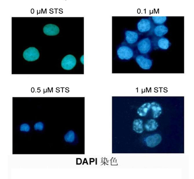操作流程:使用不同濃度星飽菌素(Staurosporine,STS)凋亡處理Jurkat細(xì)胞。調(diào)整細(xì)胞密度為1×106/ml,每孔2 ml接種于六孔板中;加入終濃度為0,0.1,0.5,1 μM STS,37℃ 5%CO2培養(yǎng)3小時;500 g 3 min收集細(xì)胞;細(xì)胞沉淀中加入1 ml固定液,常溫固定10 min;1×PBS漂洗兩次;細(xì)胞沉淀中加入0.5 ml DAPI染色液,37℃避光染色10 min;離心后細(xì)胞沉淀重懸于100 μl 1×PBS中;取5 μl細(xì)胞懸液滴于載玻片上,加5 μl 抗熒光淬滅劑,封片觀察。