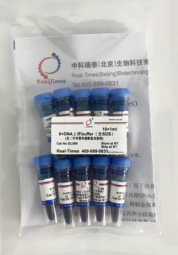 6×DNA上樣緩沖液(含SDS)用于結(jié)合有大量蛋白的DNA樣品的瓊脂糖凝膠電泳。其中含有0.54% SDSSDS可消除DNA-蛋白質(zhì)之間的相互作用,同時(shí)含有50 mM  EDTA,它可結(jié)合二價(jià)金屬離子,抑制金屬離子依賴的酶反應(yīng),從而保護(hù)DNA。6×DNA上樣緩沖液(含SDS)含有兩種示蹤染料:溴酚藍(lán)和二甲苯菁FF