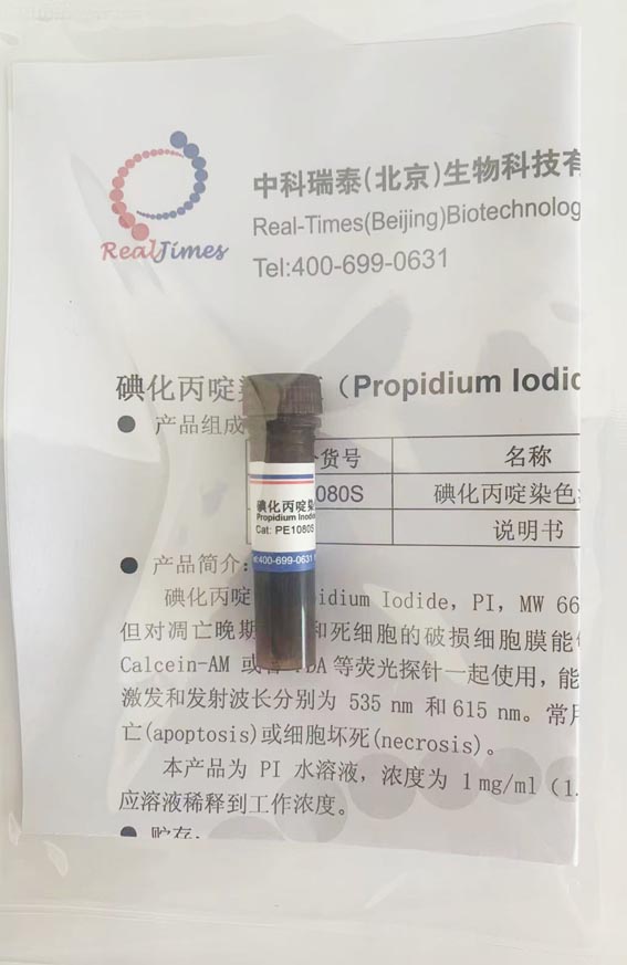 碘化丙啶(propidium iodide,PI),分子式C27H34I2N4 ,MW 668.39,CAS:25535-16-4。碘化丙啶不能穿過完整的活細(xì)胞膜,即正常細(xì)胞和凋亡細(xì)胞在不固定的情況下對(duì)PI拒染,而壞死細(xì)胞由于失去膜的完整性,PI可進(jìn)入細(xì)胞內(nèi)與DNA結(jié)合,根據(jù)此特點(diǎn),使用PI染色可鑒別死細(xì)胞。如果使用PI對(duì)活細(xì)胞染色必須在染色前進(jìn)行固定,以增加細(xì)胞膜對(duì)染料的通透性。PI經(jīng)常被用來與 Calcein-AM 或者 FDA等熒光探針一起使用,能同時(shí)對(duì)活細(xì)胞和死細(xì)胞染色。 PI-DNA復(fù)合物的激發(fā)和發(fā)射波長(zhǎng)分別為 535 nm 和615 nm。常用于流式細(xì)胞儀分析和顯微鏡觀察,檢測(cè)細(xì)胞凋亡(apoptosis)或細(xì)胞壞死(necrosis)。