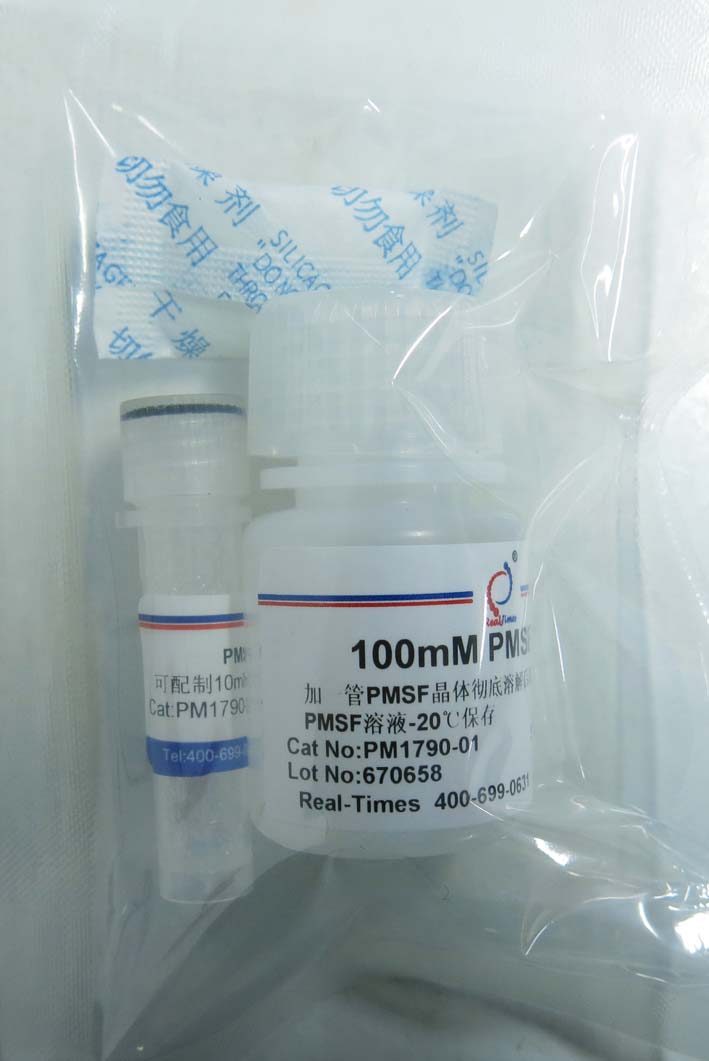 取一管PMSF晶體全部加入到PMSF溶解液中,徹底溶解后即配成100mMPMSF溶液。在蛋白提取緩沖液中稀釋100倍使用,如500 μl提取緩沖液中加入5 μl。