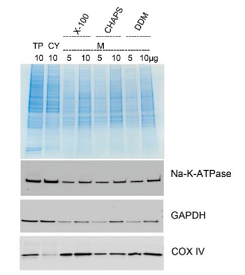 樣品:TPRIPA提取總蛋白做對照;CY為膜蛋白提取上清-胞漿蛋白;M為使用不同去垢劑提取的膜蛋白