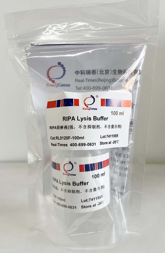 RIPA裂解液(RIPA  Lysis  Buffer)是一種傳統(tǒng)的細(xì)胞組織快速裂解液。RIPA裂解液裂解得到的蛋白樣品可以用于常規(guī)的Western、IP等。RIPA的本意是Radio  Immunoprecipitation  Assay。RIPA裂解液的配方有很多種,根據(jù)其裂解液的強(qiáng)度大致可以分為強(qiáng)、中、弱三類。該RIPA裂解液(強(qiáng))的主要成分為50 mM Tris (pH 7.4),150 mM NaCl,1% Triton X-100,1% sodium deoxycholate,0.1% SDS,不含蛋白酶抑制劑,不含磷酸酶抑制劑,不含螯合劑如EDTA或EGTA,可適用于明膠酶譜實(shí)驗(yàn)的蛋白提取。使用前根據(jù)實(shí)驗(yàn)需要添加蛋白酶抑制劑或磷酸酶抑制劑以及EDTA或EGTA。