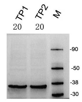 轉(zhuǎn)膜:NC膜,1×RealBlot快速轉(zhuǎn)膜液濕轉(zhuǎn),穩(wěn)流400 mA,電壓變化64-57 V,轉(zhuǎn)膜時間35 min