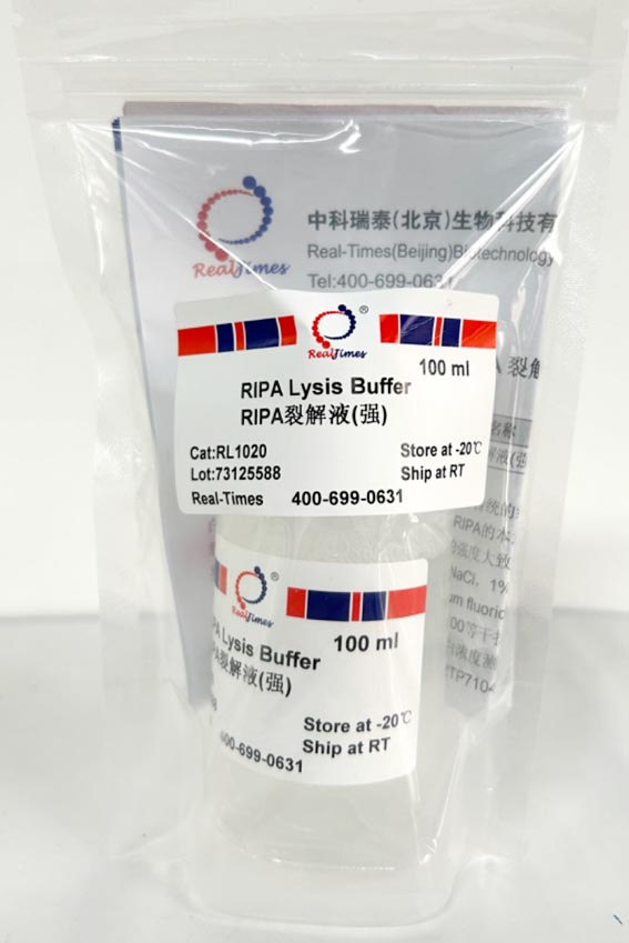 RIPA裂解液(RIPA Lysis Buffer)是一種傳統(tǒng)的細(xì)胞組織快速裂解液。RIPA裂解液裂解得到的蛋白樣品可以用于常規(guī)的Western、IP等。RIPA的本意是Radio  Immunoprecipitation  Assay。RIPA裂解液的配方有很多種,根據(jù)其裂解液的強(qiáng)度大致可以分為強(qiáng)、中、弱三類。RIPA裂解液(強(qiáng))的主要成分為50 mM Tris (pH 7.4),150 mM NaCl,1% Triton X-100,1% sodium deoxycholate,0.1% SDS,以及sodium orthovanadate,sodium fluoride,EDTA,EGTA等多種抑制劑。可以有效抑制蛋白降解。由于含有較高濃度的Triton X-100等干擾物質(zhì),不能用傳統(tǒng)Bradford法測定由本裂解液裂解得到樣品的蛋白濃度,可以使用BCA蛋白濃度測定試劑盒(貨號:RTP7102)或Bradford蛋白濃度測定試劑盒(去垢劑兼容型)(貨號:RTP7104)測定蛋白濃度。