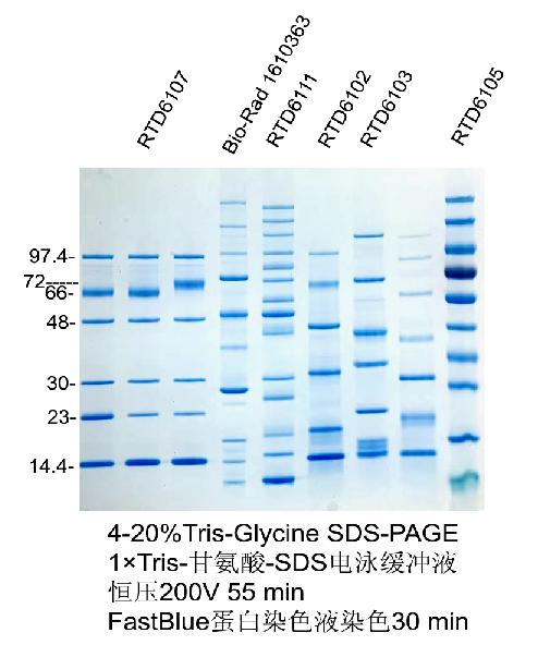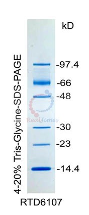 本產(chǎn)品包含6種已知分子量的標(biāo)準(zhǔn)蛋白質(zhì)組成,分子量范圍為14.4-97.4 kD,可以用來(lái)判斷 SDS-PAGE未知蛋白的分子量。本產(chǎn)品為非預(yù)染蛋白Marker,電泳后需要染色后觀察條帶。