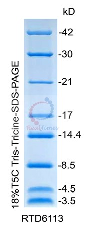 本產(chǎn)品包含8種低分子量蛋白質(zhì),分子量范圍為3.5-42 kD,通過 Tris-Tricine-SDS-PAGE電泳并經(jīng)考馬斯亮藍染色后可見分子量大小為3.5,4.5,8.5,14.4,17,21,30,42 kD的條帶。
