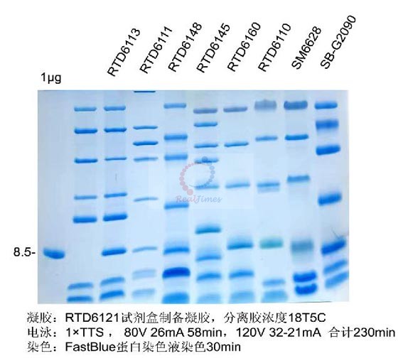 凝膠也可以使用常規(guī)考馬斯亮藍染色液(配方7)和脫色液(配方8)進行染色和觀察。需要注意的是,常規(guī)染色和脫色方法需要較長時間,小肽由于長度較短,和凝膠結(jié)合不緊密,長時間在溶液中浸泡容易從凝膠中脫離。FastBlue蛋白染色液(貨號:RTD6202)除具有染色快,無毒,靈敏性高等特點外,還能對小肽在染色中起到固定作用,不至于小肽在染色和脫色中從凝膠中脫離,是常規(guī)染色液的理想替代品。