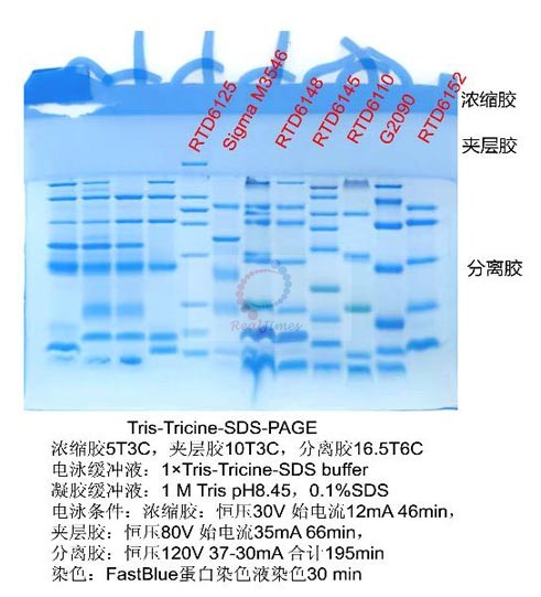 (含預(yù)染Marker)(貨號(hào):RTD6121)或Tris-Tricine-PAGE凝膠制備及電泳試劑盒(多肽變性電泳)(貨號(hào):RTD6122)進(jìn)行Tricine電泳,方便快捷?;蛘吒鶕?jù)以下程序制備凝膠,先配制分離