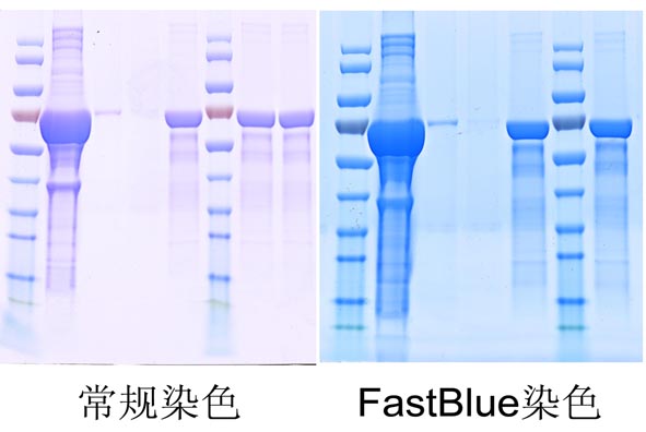 A3 FastBlue染色原理與經(jīng)典考馬斯亮藍(lán)G250染色原理相同(與蛋白質(zhì)中堿性氨基酸結(jié)合),優(yōu)點(diǎn)是更加快速和更高的靈敏度。