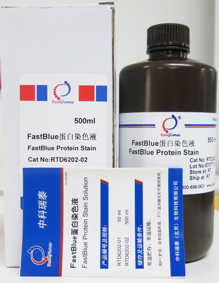 FastBlue蛋白染色液是以考馬斯亮藍(lán)G-250為主要成分,采用新配方配置而成??捎糜赟DS-PAGE或非變性PAGE膠(native gel)的快速染色。