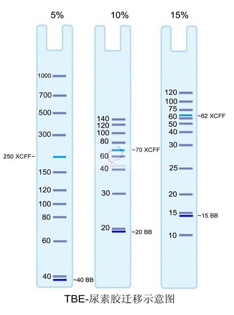 1.1單鏈DNA樣品加入等體積的2×TBE尿素上樣緩沖液(用于尿素變性膠)(貨號:DL080);RNA樣品加入等體積的2×RNA上樣緩沖液 (尿素變性膠,RNase-free) (貨號:RTE4103-05);70℃孵育5分鐘以充分變性核酸以打開核酸的二級結(jié)構(gòu),立即置于冰水浴中。 建議每孔上樣0.2-0.5 μg左右即可。
