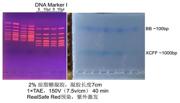 4. 推薦使用RealSafe系列染料(貨號:GR002,GR003,GR004)染色。如果使用Goldview或EB等染料進行染色,由于此類染料帶更多的正電荷(染料移動方向與核酸泳動方向相反),隨著電泳時間延長,染料向大片段聚集,凝膠會出現(xiàn)陰陽膠現(xiàn)象(染料含量高的凝膠紫外下較亮,含量低的凝膠紫外下發(fā)暗),導(dǎo)致小分子量DNA顯色很弱或不可見。陰陽膠可以在電泳結(jié)束后浸泡染色,將膠浸沒在含1 μg /ml EB或Goldview的電泳緩沖液中20-25 min,小分子量DNA會顯色清楚。更長時間浸泡會因DNA分子擴散而使條帶彌散,小分子量DNA更易彌散。