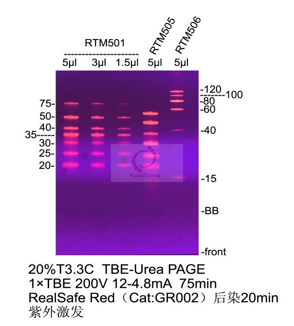 用單鏈DNA PAGE電泳染色試劑盒(Cat:RTS5103),核酸PAGE電泳染色試劑盒(Cat:RTS5102)或核酸快速高靈敏度染色試劑盒(Cat:RTS5101)染色均可以得到清晰的條帶分離效果。注:如果使用核酸染料染色,RealSafe Red(貨號(hào):GR002)或RealSafe All(貨號(hào):GR004)核酸染料結(jié)合單鏈核酸效果最佳,強(qiáng)烈建議使用以便獲得最佳效果的膠圖。其余染料如GelRed,Goldview,EB等染色效果不好。