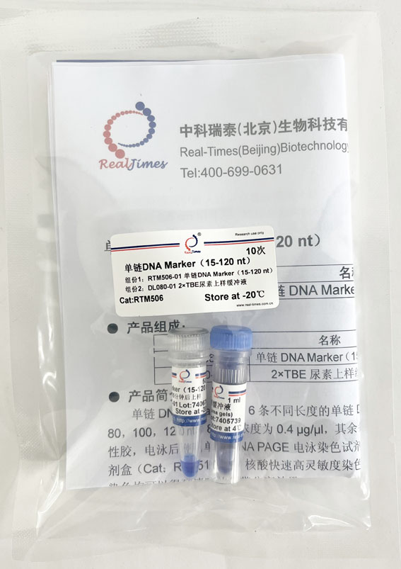 單鏈DNA  Marker由6條不同長度的單鏈DNA分子混合而成,6條帶的大小為15,40,60,80,100,120 nt,80 nt 濃度為0.4 μg/μl,其余條帶濃度為0.2 μg/μl。該Marker適用于跑尿素變性膠,電泳后使用單鏈DNA PAGE電泳染色試劑盒(Cat:RTS5103),核酸PAGE電泳染色試劑盒(Cat:RTS5102),核酸快速高靈敏度染色試劑盒(Cat:RTS5101)或RealSafe類核酸染料染色均可以得到清晰的條帶分離效果。