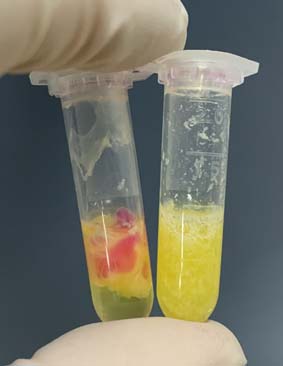 左側(cè)未完全混勻,有紅色;右側(cè)完全混勻,呈均勻黃色
