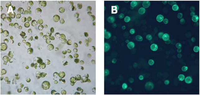 注:酶解時間與葉片種類,葉片生長狀態(tài)有關(guān),請根據(jù)實(shí)驗需要適當(dāng)調(diào)整酶解時間。3小時為擬南芥葉片推薦的酶解時間。如條件允許,可以使用微型真空泵常溫避光條件下抽真空30 min,以使酶溶液更好地進(jìn)入細(xì)胞間隙。酶溶液變?yōu)榫G色表明有原生質(zhì)體已經(jīng)有分離,溶液為濃綠色表明原生質(zhì)體已經(jīng)大量分離。擬南芥原生質(zhì)體大小約為30-50 μm,顯微鏡鏡檢后確定是否分離。葉片原生質(zhì)體細(xì)胞顯微鏡下為綠色圓球狀,葉綠體分散在整個細(xì)胞內(nèi),說明狀態(tài)較好;如呈現(xiàn)不規(guī)則形狀,說明原生質(zhì)