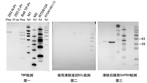 1. 在完成Western化學(xué)發(fā)光檢測后,NC膜或PVDF膜用適量蒸餾水中震蕩漂洗5分鐘;重復(fù)漂洗2次;1×TBST漂洗一次。